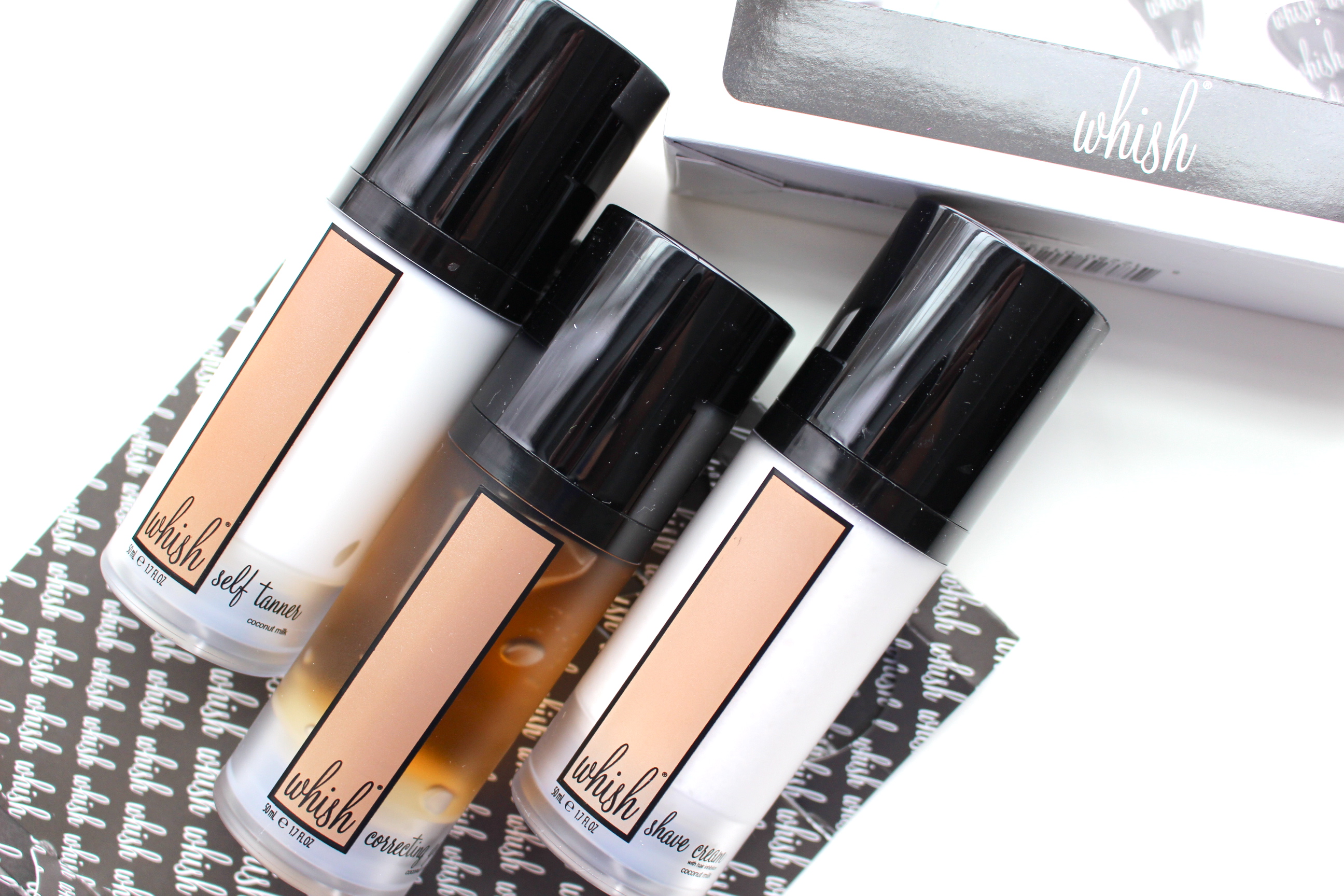 1 .:. WHISH Ammo Kit .:. This kit comes with shaving cream, self tanner AND correcting gel. Start with clean, prepped skin by shaving to fully remove dead skin cells and soften and smooth skin. After doing so move on to the Coconut Milk Self Tanner, this has the consistency of a body butter and a pleasing sweet scent, and is gentle enough to apply everyday for firm, tanned skin. If you do choose to hit the beach and lay out in the sun, apply the Coconut Correcting Gel afterwards for fully moisturized, soothed skin. It contains loads of skin soothing ingredients including, manuka honey, organic chinese boxthorn and organic acai berry extract all to decrease the appearance of sun damage.