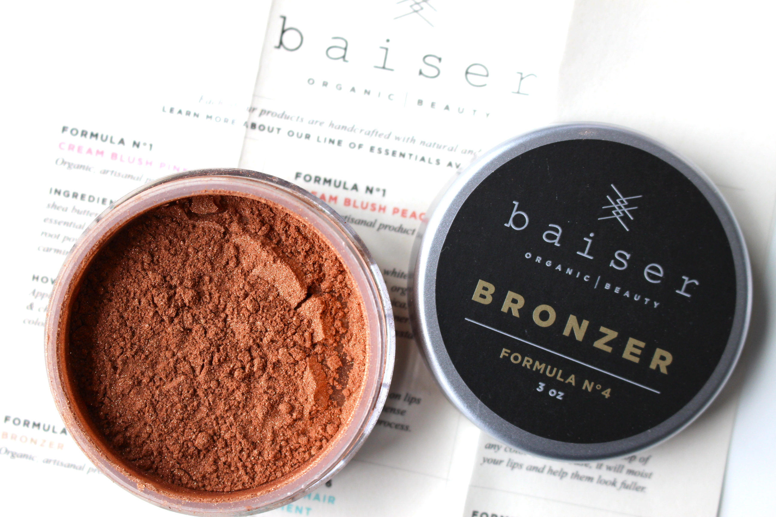 5 .:. BAISER BEAUTY Bronzer .:. Finish your sun-kissed look with this natural and organic bronzer. Arrowroot, cocoa powder, cinnamon and mica make this super pigmented, and a very little goes a long way. Swipe a light dusting across cheeks or any area you wish for a natural bronze affect and added contour.