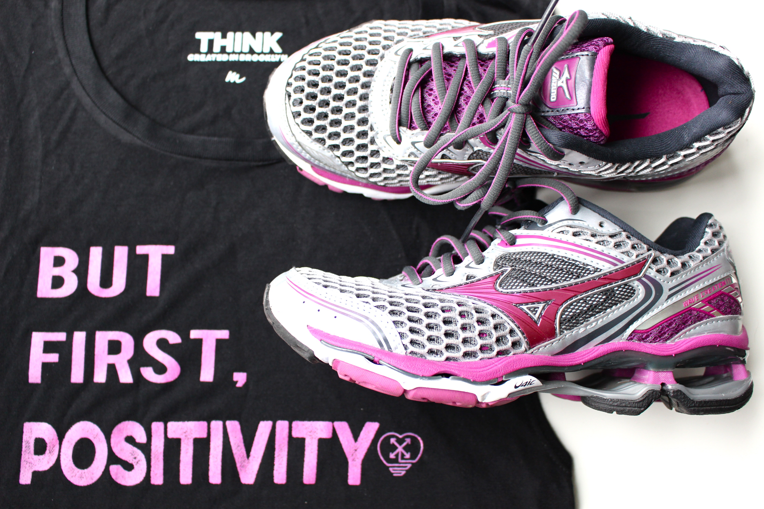 Stay motivated while staying comfortable. I love wearing inspirational tanks like the But, First POSITIVITY tank from one of my favorite clothing lines Think Allways. All of their clothing stands as a continual reminder that you can achieve anything you set your mind to. I pair all of my fitness outfits with the Mizuno Wave Creation 17 sneakers. The breathable mesh, stress-minimizing dynamotion fit and infinity wave heel give you extra support during even the most intense of exercises.