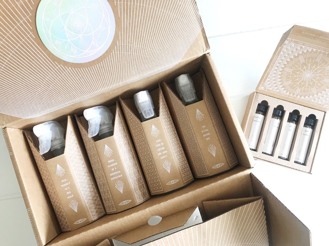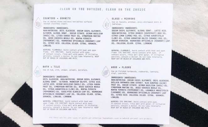 So I was so excited to come across this brand on my search for THE BEST all-natural products. Here’s how it works: start out by purchasing the Starter Set which includes 4 reusable glass bottles and 4 (1oz) conscious concentrate viles for Counters + Granite, Glass + Mirrors, Bath + Tile, Wood + Floors. Once received, fill the reusable glass bottles with filtered water, pour in each concentrate to designated bottle, shake to combine and clean away!